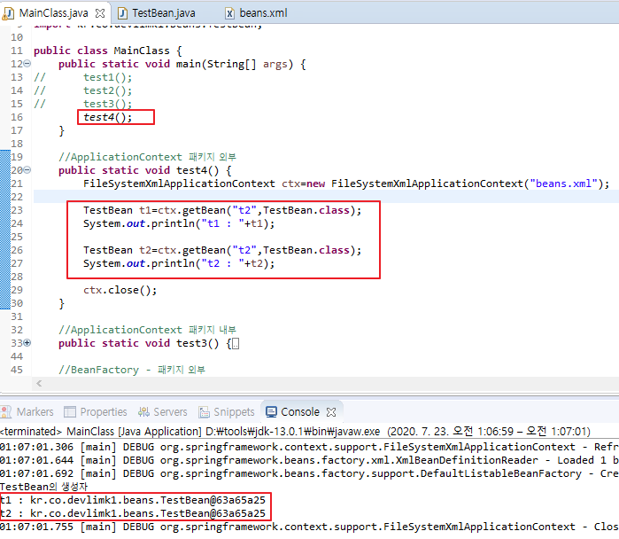 xml파일이 로딩될 때 이미 생성된 객체의 주소값을 동일하게 사용하는 것을 볼 수 있다.