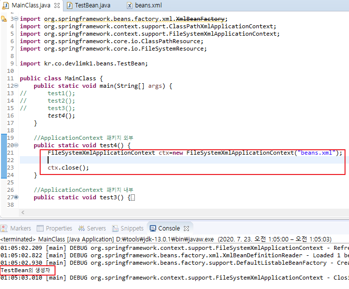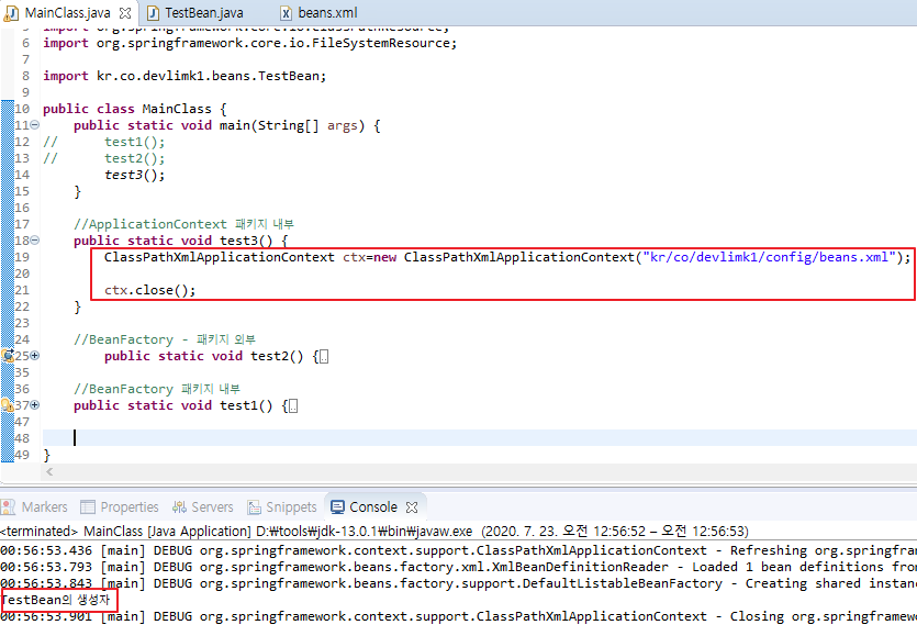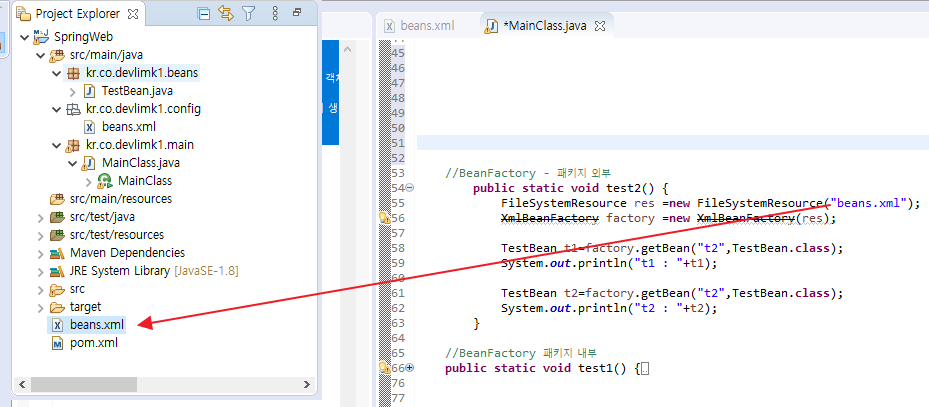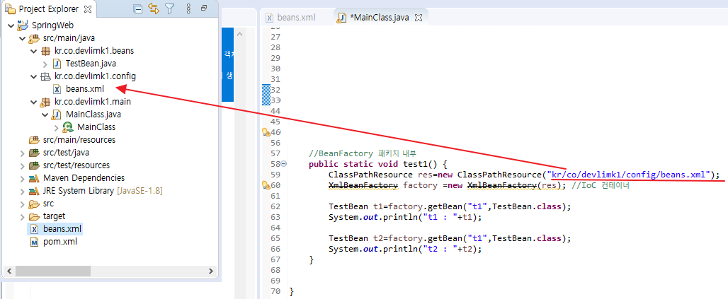 - ClassPathXmlApplicationContext ctx = new ClassPathXmlApplicationContext("kr/co/devlimk1/config/beans.xml");
