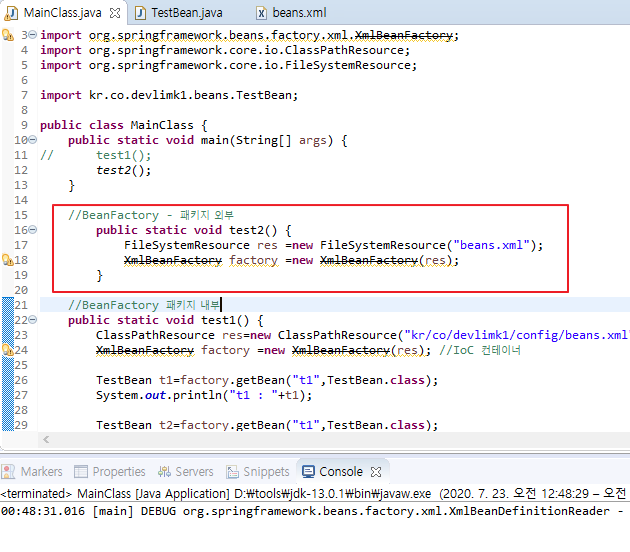 - ClassPathResource res = new ClassPathResource("kr/co/devlimk1/config/beans.xml");