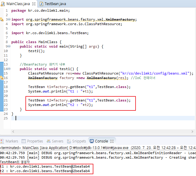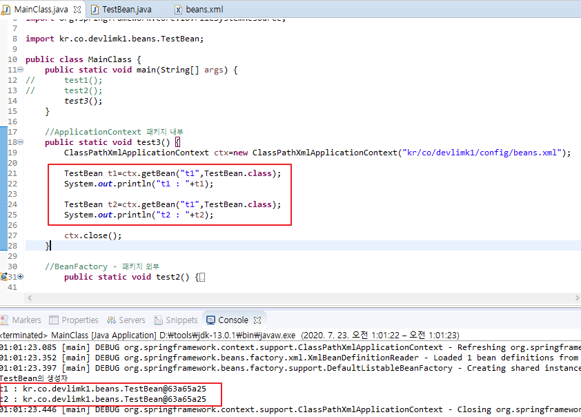 이미 만들어진 객체를 IoC컨테이너가 보관해서 같은 id(beans.xml의 id="t1")로 객체를 가지고 오면 이미 생성된 객체 주소값을 반환해서 사용할 수 있겠다.