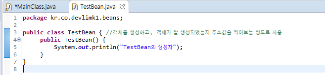 System.out.println("TestBean의 생성자");