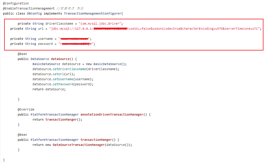 MySQL에 사용할 DB의 사용자계정 정보를 코드에 정의하였다. (빨간 네모박스)
