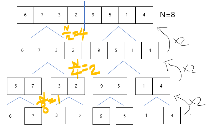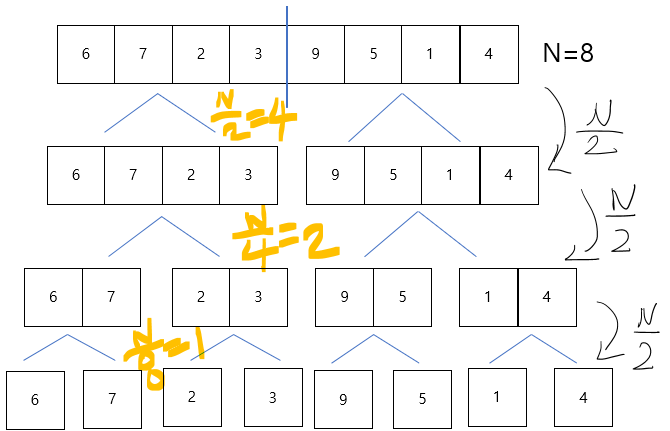 N=8인 배열을 한 개의 배열이 될 때까지 2로 나누면서(N/2) 분할합니다.
