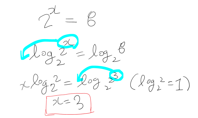 x를 구하기 위해서 위와 같이 2를 밑으로 하는 log로 식을 써서 구해보니 x=3이 나온 것을 알 수 있습니다.