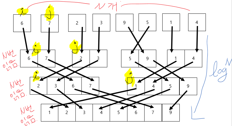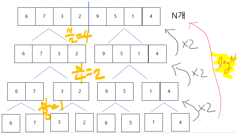 😀 맨 아래에서 N개가 되기까지 높이가 logN인 것을 확인하실 수 있겠죠?