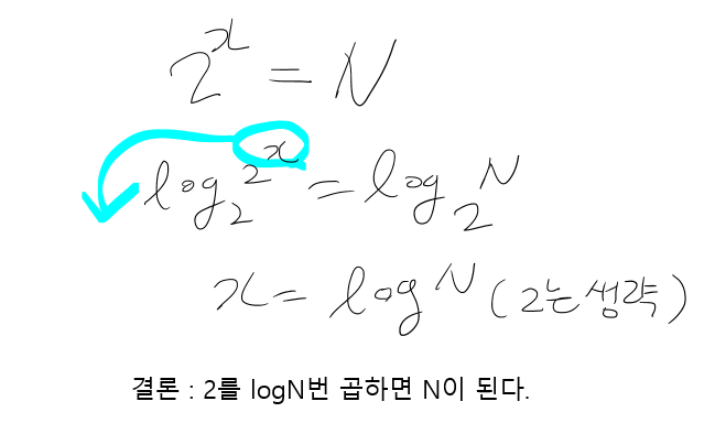 이 말은, 2를 logN 만큼 곱해야 N이 된다는 것이죠.