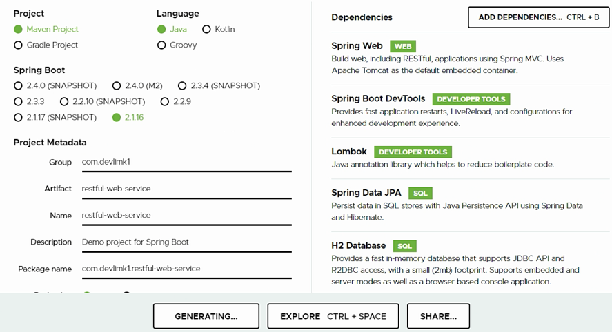 😀 Spring initializr 에서 필요한 Project 설정들과 Dependencies 설정 후 GENERATE(생성) 버튼 클릭