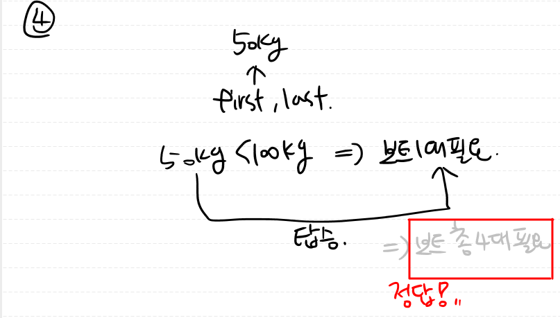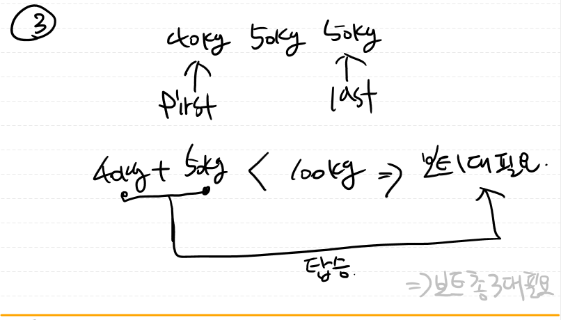 limit : 100kg 가정 - 무게가 가장 적게 나가는 사람~ 많이 나가는 사람으로 오름차순 정렬