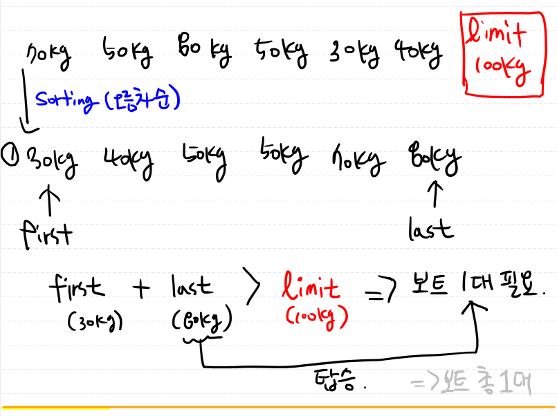 - first + last > limit 라면, 보트 1대 추가 ⇒ last인 사람 한명 탑승