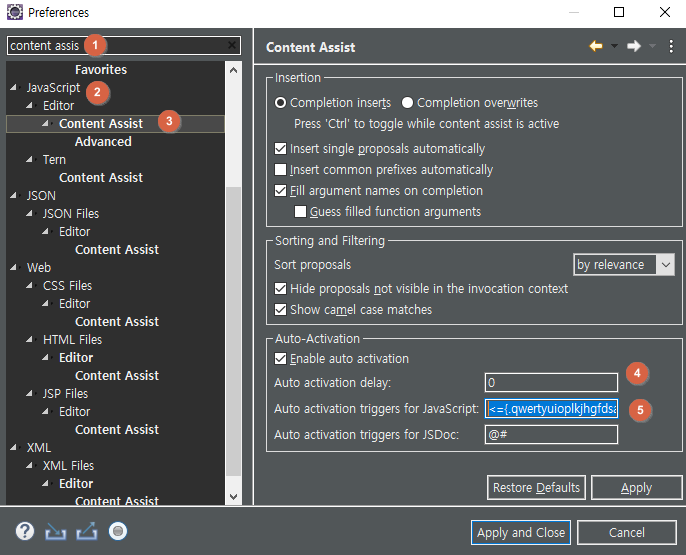 꿀팁+)위와 같이 글자 입력하면 바로 content assist를 띄우게하려면 자동완성 기능 옵션을 추가해야한다.
