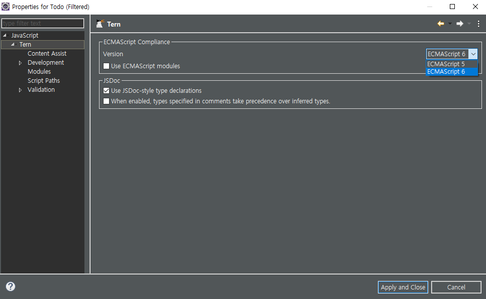 ECMAScript 6버전을 사용하고 싶으면 아래 Tern 탭에서 변경가능