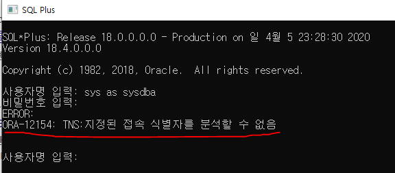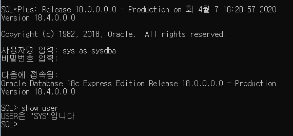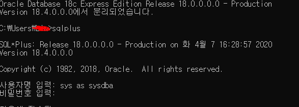 명령프롬프트(CMD)창에서 sqlplus 입력해서 접속하여