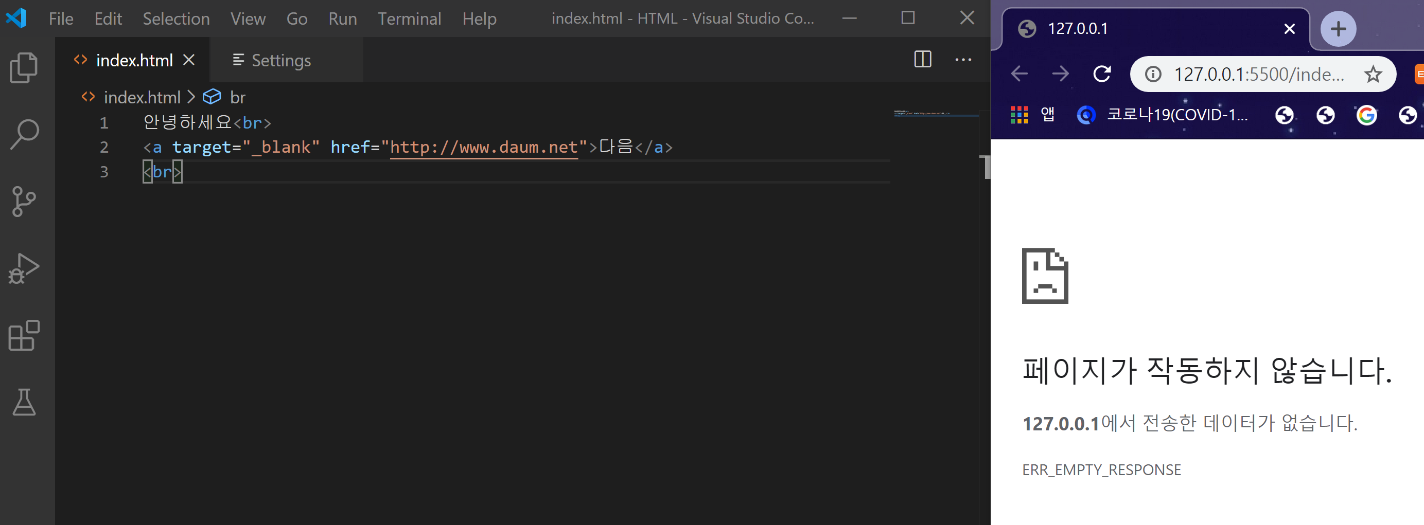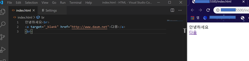 Visual Studio Code 에서 HTML 파일 결과를 브라우저에서 쉽게 확인할 수 있는 확장프로그램인 Live Server를 사용하여 실행시키는데