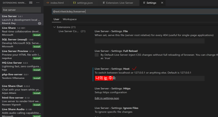 3) 설치한 Live Server 톱니바퀴 클릭 후 Extension Settings 클릭