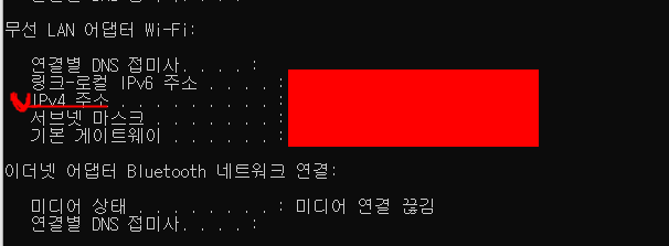 명령 프롬프트(CMD) 창에서 ipconfig 입력 후