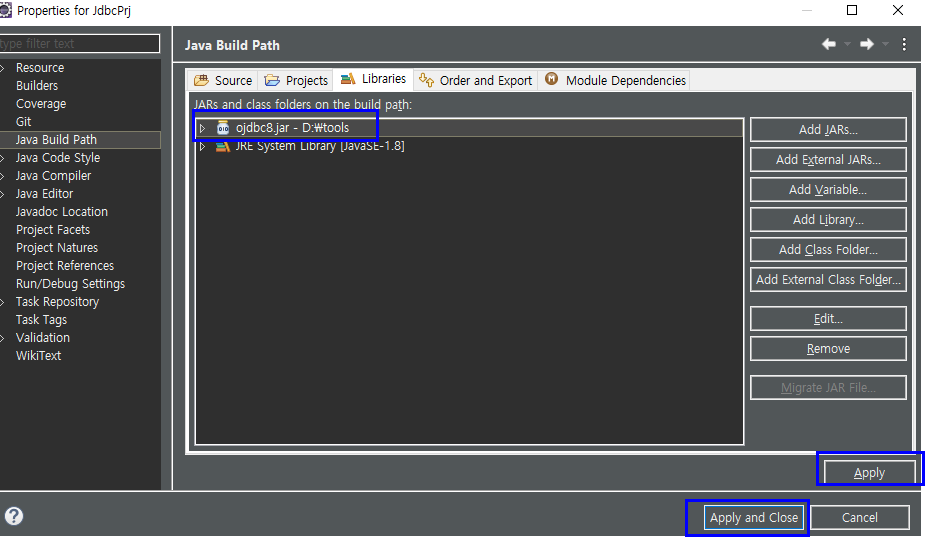 8) 설치한 ojdbc8.jar 선택 후 열기 -> Apply -> Apply and close