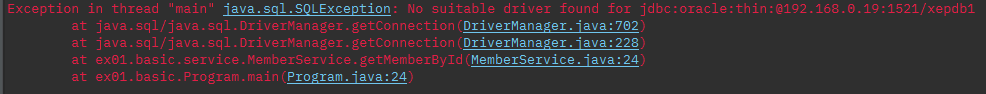 Exception in thread "main" java.sql.SQLException: No suitable driver found for jdbc:oracle:thin:@192.168.0.19:1521/xepdb1